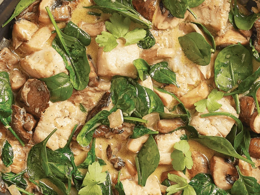 Quando o peixe começar a cozinhar, acrescente os espinafres, as natas e o caldo de peixe e mexa bem.