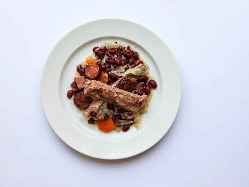 Adicione o feijão encarnado e a couve à feijoada. Retifique os temperos e deixe cozinhar a feijoada em lume brando até molho ganhar alguma consistência.