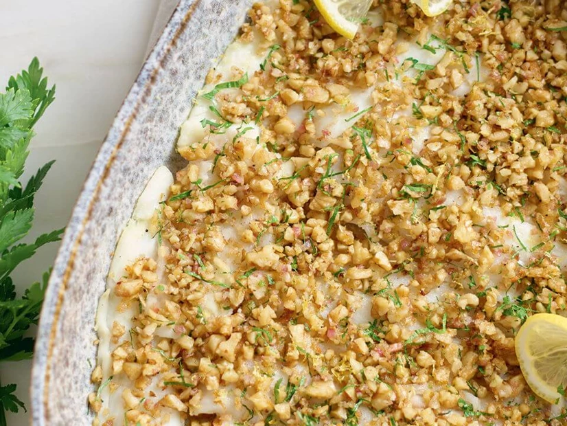 Retire o excesso de água, não toda, e divida o crocante de nozes por cima de cada filete.