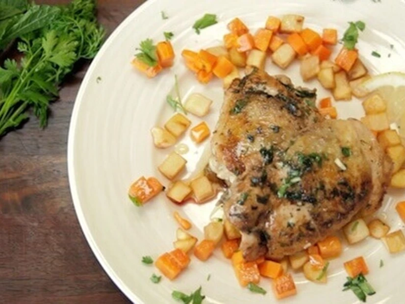 Numa frigideira quente com um fio de azeite marcar bem as coxas de frango e deixar cozinhar com a tampa. Depois adicionar a manteiga, o mel e a mostarda à restante marinada, mexer bem até homogeneizar o molho e pincelar o frango. Tapar e deixar dourar. Quando o frango estiver cozinhado retirar e servir com a mistura de batatinhas, cenoura e abóbora fritas. Decorar o prato com ervas frescas picadinhas.