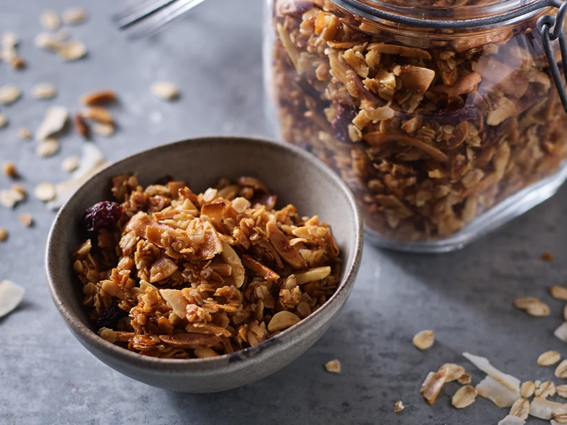 Forre uma assadeira grande com papel vegetal e espalhe a granola numa camada uniforme. Leve ao forno pré-aquecido a 160ºC por 20 minutos.