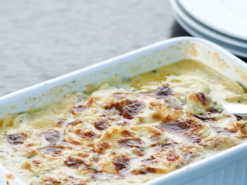 Verta o preparado anterior sobre as batatas e os cogumelos. Leve ao forno a gratinar durante 20 minutos a 210ºC. Polvilhe com o restante queijo parmesão.