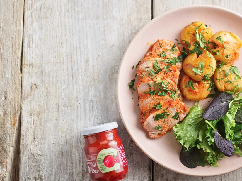 • Coloque o lombinho de porco num tabuleiro, esfregue-o com a massa