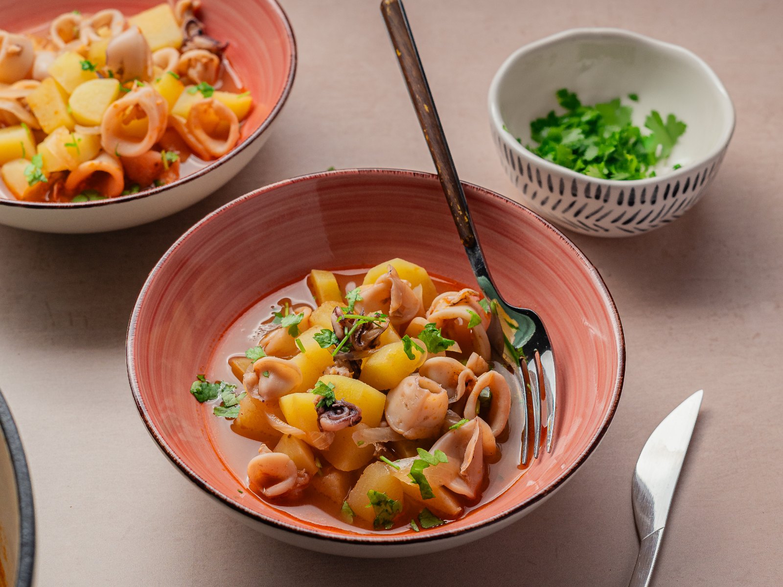 Adicione as lulas, o louro, o vinho, os temperos e deixe cozinhar por 25 minutos mexendo regularmente.