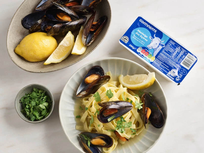 Num prato de sopa, coloque a massa escorrida e por cima os mexilhões e o seu molho.