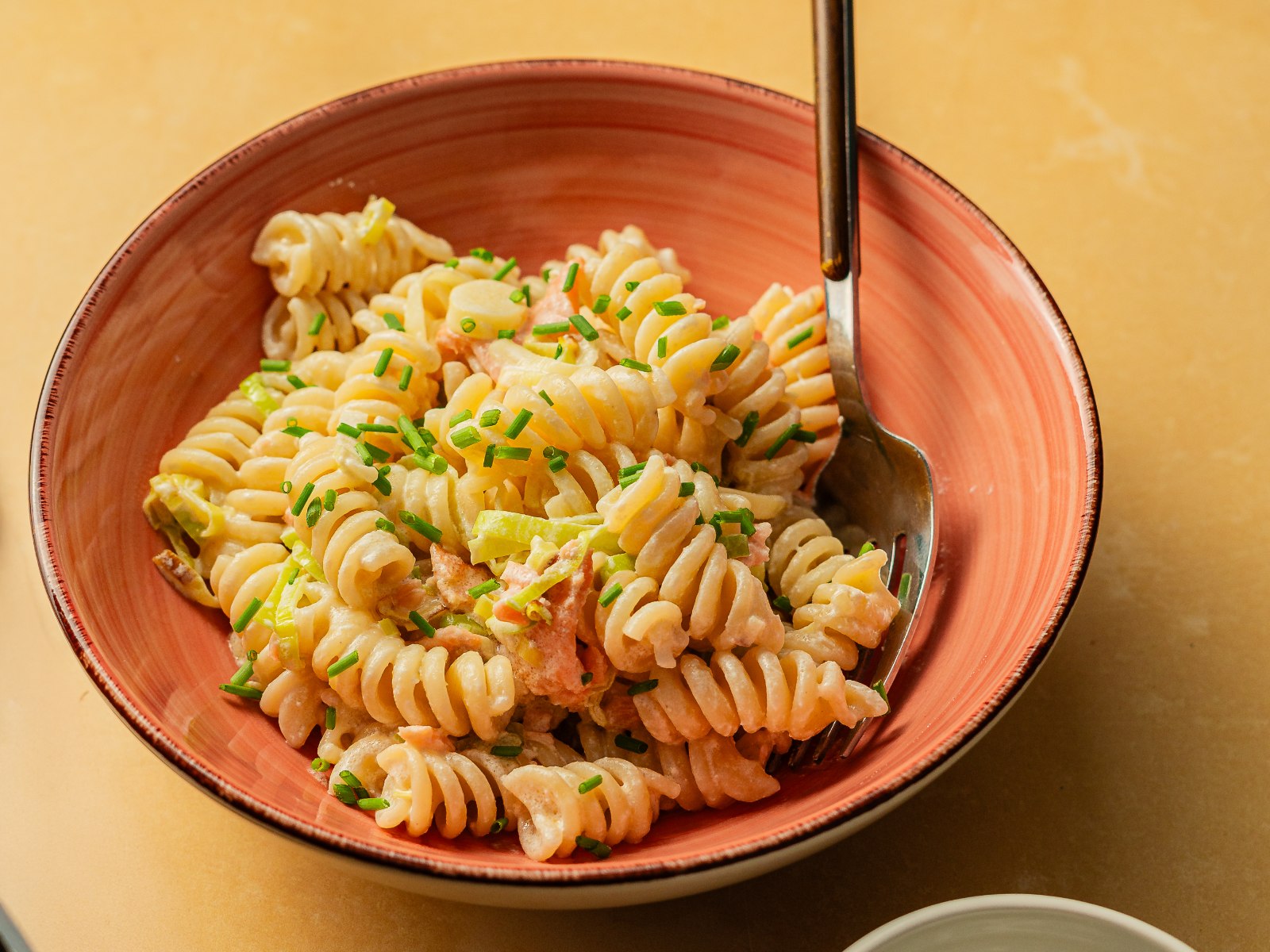 De seguida juntar o salmão e massa fusilli previamente cozida e escorrida e o queijo parmesão ralado. Envolver bem.