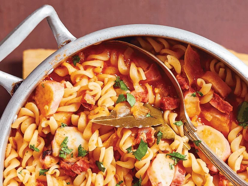 Junte o vinho branco e o caldo de peixe, deixe levantar fervura e insira a massa.