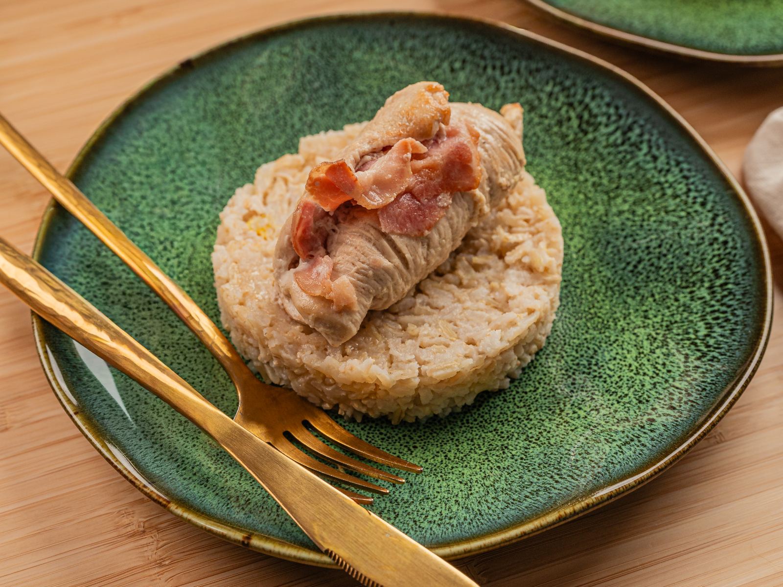 Sirva os medalhões de peru e bacon acompanhados de arroz branco.