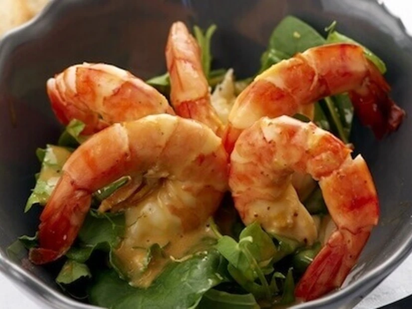 Numa saladeira coloque a mistura de salada, adicione os camarões cozidos. Verta o molho sobre este preparado envolvendo delicadamente. Decore com as gambas e sirva.