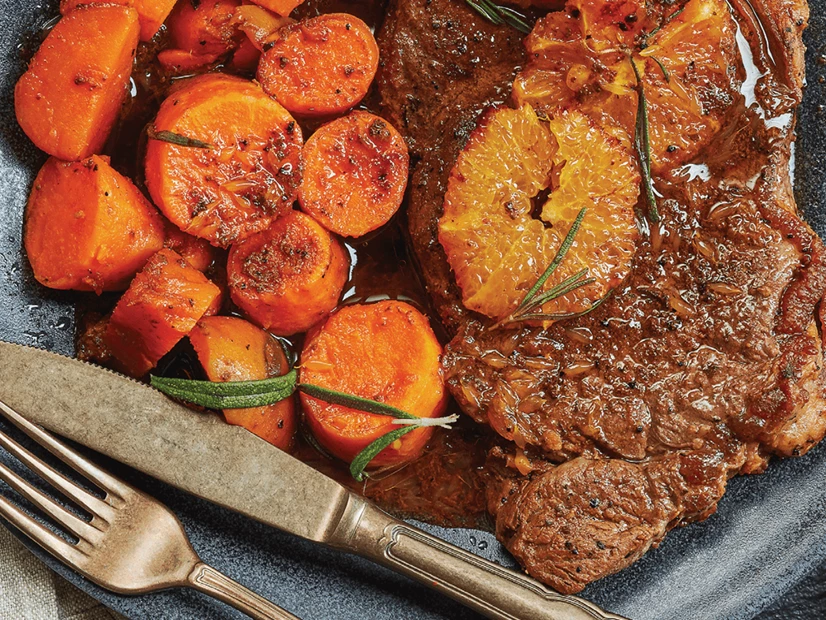 Sirva os bifes com as laranjas e as batatas-doces assadas.