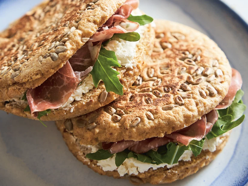 Cozinhe por 1 a 2 minutos, vire o pão e cozinhe por mais 30 segundos. Sirva com queijo creme, presunto e rúcula.