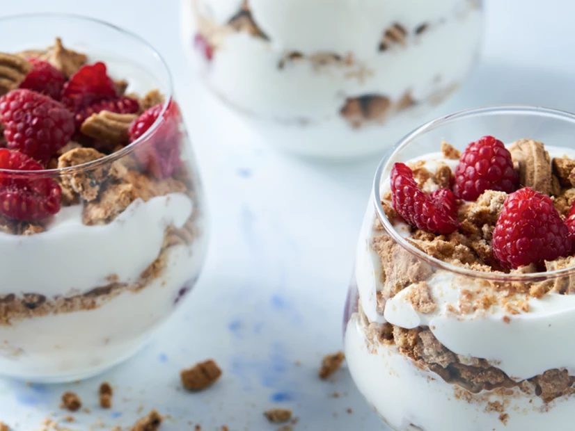 Divida 2 iogurtes gregos naturais por 4 copos e de seguida distribua metade das bolachas por cima. Volte a dividir mais 2 iogurtes gregos naturais pelos copos, acrescente as restantes bolachas e termine com 150 g de framboesas frescas. Sirva de seguida.