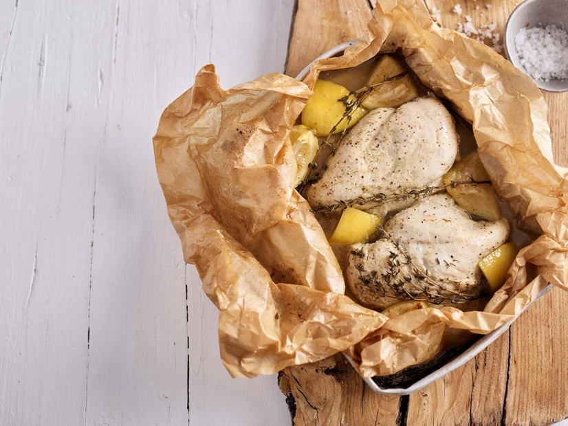 • Coloque uma folha de papel vegetal num tabuleiro, ponha os peitos de frango no centro e espalhe ao redor a marinada.