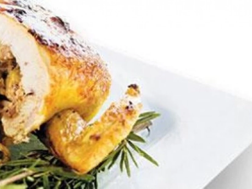 Junte os peitos de peru, polvilhe com o manjericão e regue com o vinho e leve ao forno.