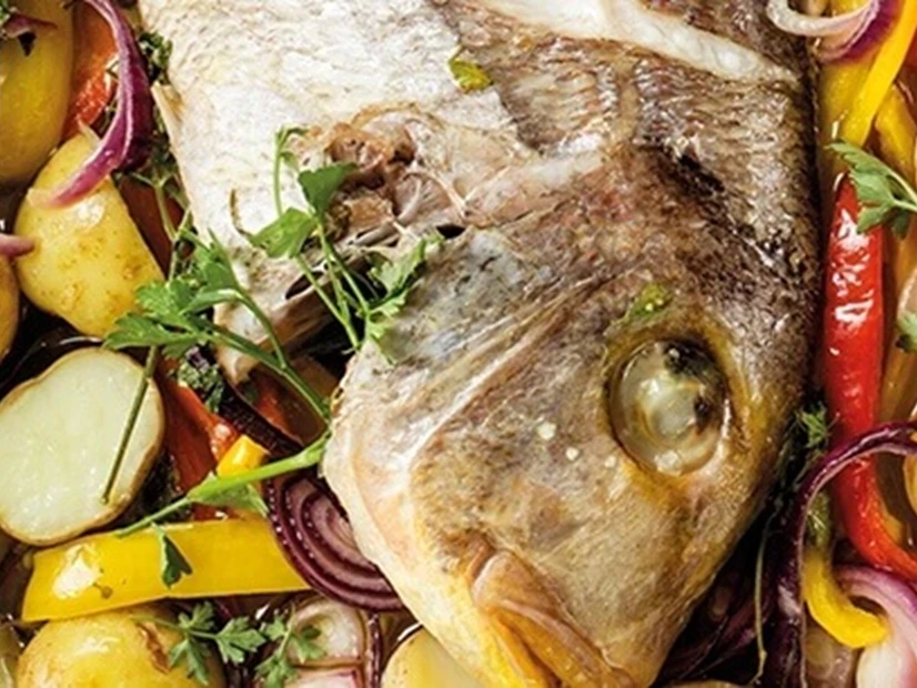 coloque o peixe previamente arranjado no centro de uma travessa de forno. Em redor, disponha os pimentos cortados em tiras e sem sementes, as cebolas descascadas e cortadas em quartos e as batatas cortadas em metades.