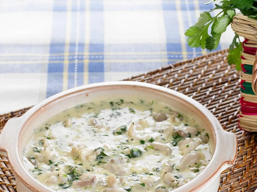 Junte o preparado da chávena ao tacho com o azeite mexendo vigorosamente. Adicione os coentros por inteiro.