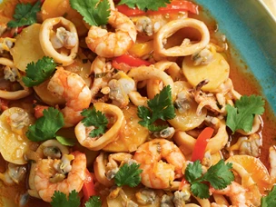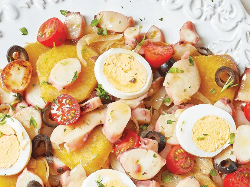 Numa travessa, monte camadas de batata, polvo e ovos cozidos. Tempere com sal e pimenta e sirva de imediato.
