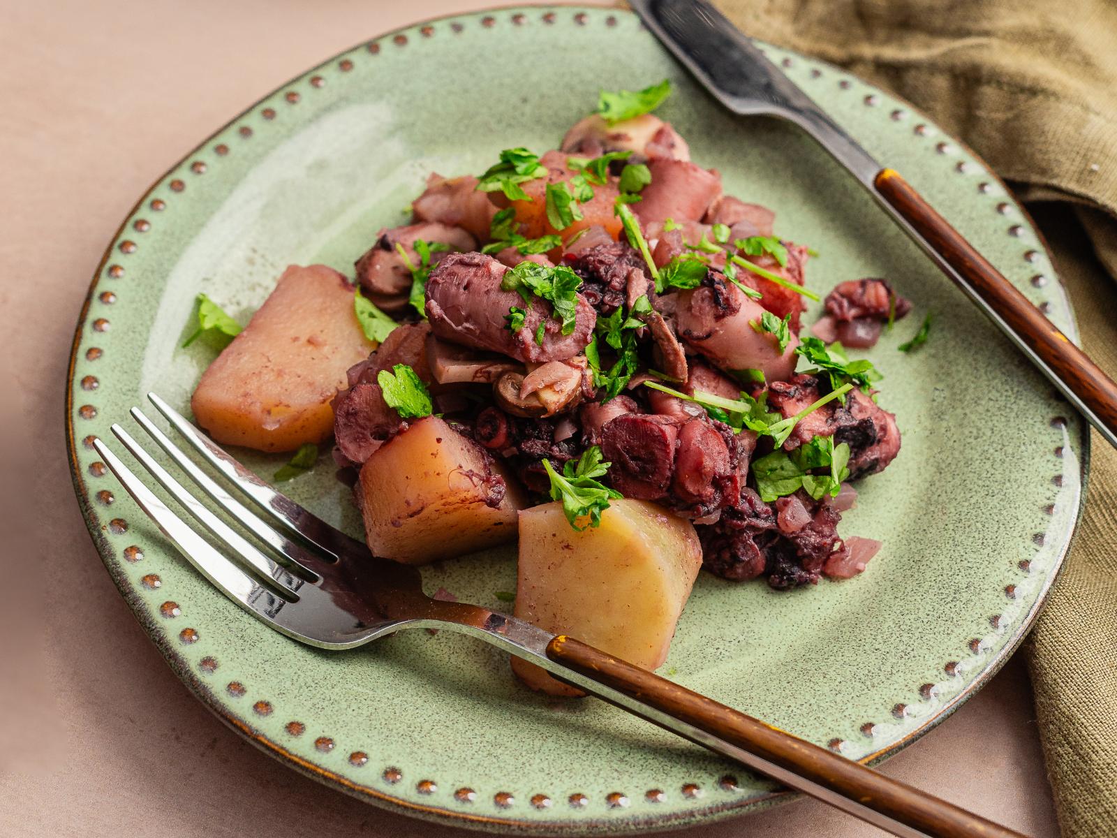 Tire as batatas-doces do forno, corte-as ao meio e sirva-as com o polvo, regando tudo com um fio de azeite.