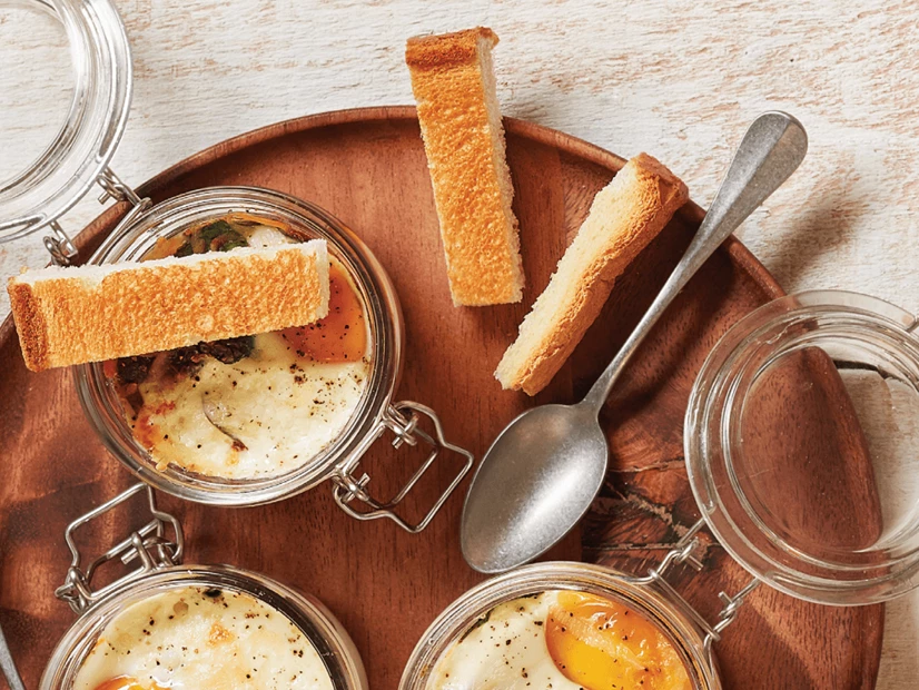 No fundo de 4 potinhos, coloque a mistura de espinafres. Sobreponha um ovo e 1 c. de sopa de natas de soja. Polvilhe com o queijo ralado e tempere com sal e pimenta.