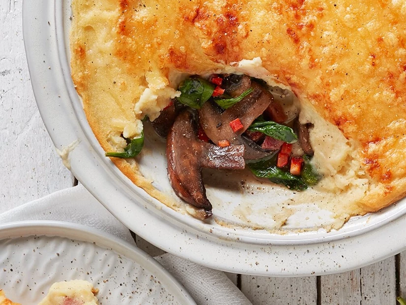 Transfira a mistura anterior para um tabuleiro de forno, espalhando-a para cobrir o fundo. Disponha por cima uma cama de puré e polvilhe com o queijo ralado. Pincele com o ovo batido e leve ao forno pré-aquecido a 200ºC por cerca de 10 minutos.