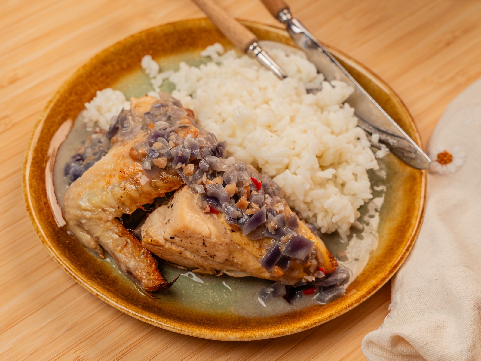Numa frigideira com azeite, faça uma cebola caramelizada com o açúcar mascavado, o vinagre de sidra e o sal grosso. Depois é só juntar os legumes escaldados e o frango desfiado.