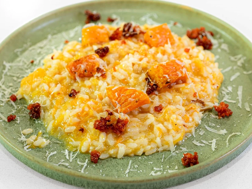 Finalize o risoto com o crocante de chouriço e pequenos cubos de abóbora assada.