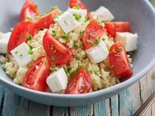 Numa outra taça, combine o bulgur com a cebola roxa e os pistáchios. Adicione a abóbora e os espinafres e envolva. Tempere com o sal.