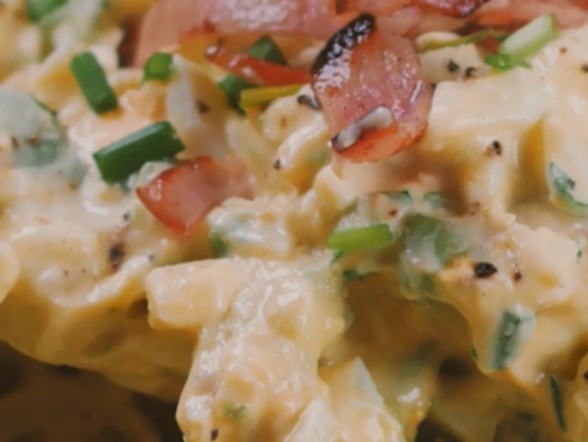 Frite as fatias de bacon até ficarem douradas. Pique-as, espalhe-as por cimada salada de ovo e polvilhe tudo com mais cebolinho picado.