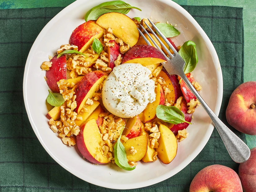 Salada de Pêssego, Burrata e Nozes, fresca e saborosa.