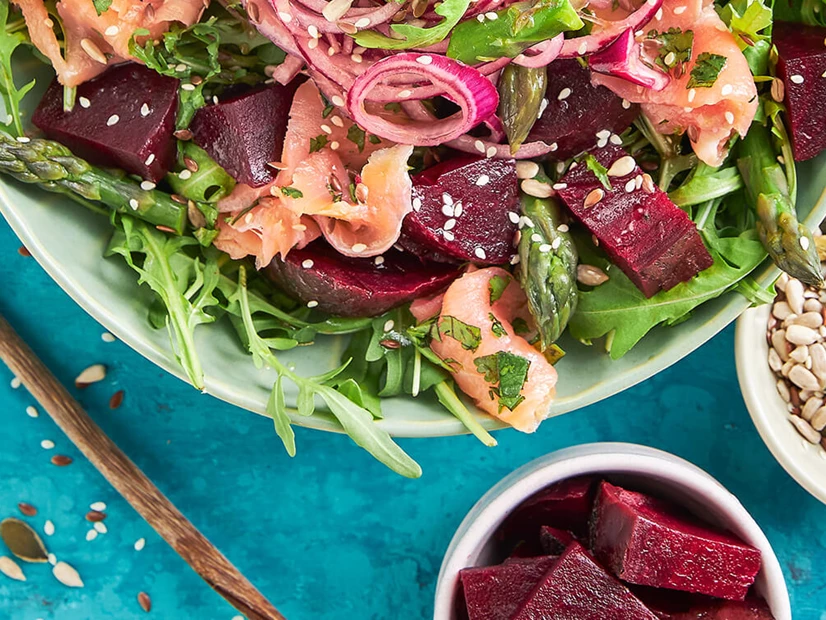 Adicione os espargos, o salmão marinado, cebola roxa em conserva e envolva mais uma vez.