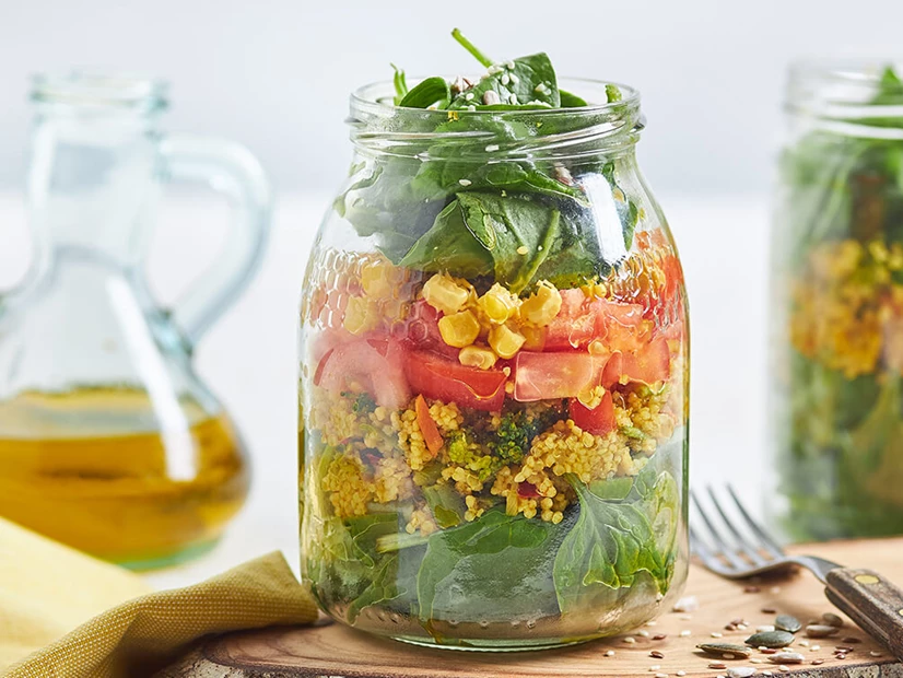 Em dois boiões de vidro faça camadas com os espinafres, o cuscuz, os tomates em cubinhos e o milho.