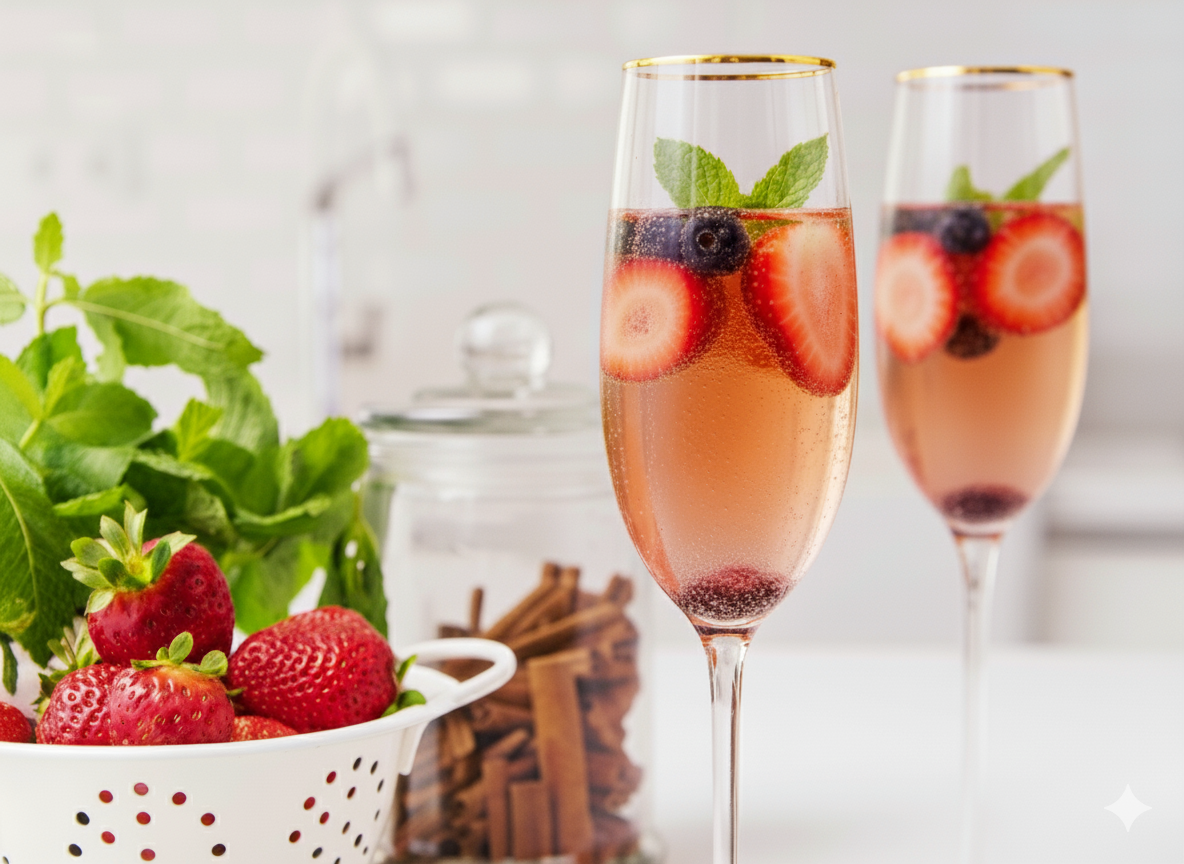 Colocar num jarro 150 g de frutos vermelhos congelados, 4 c. de sopa de açúcar mascavado e a garrafa de espumante.