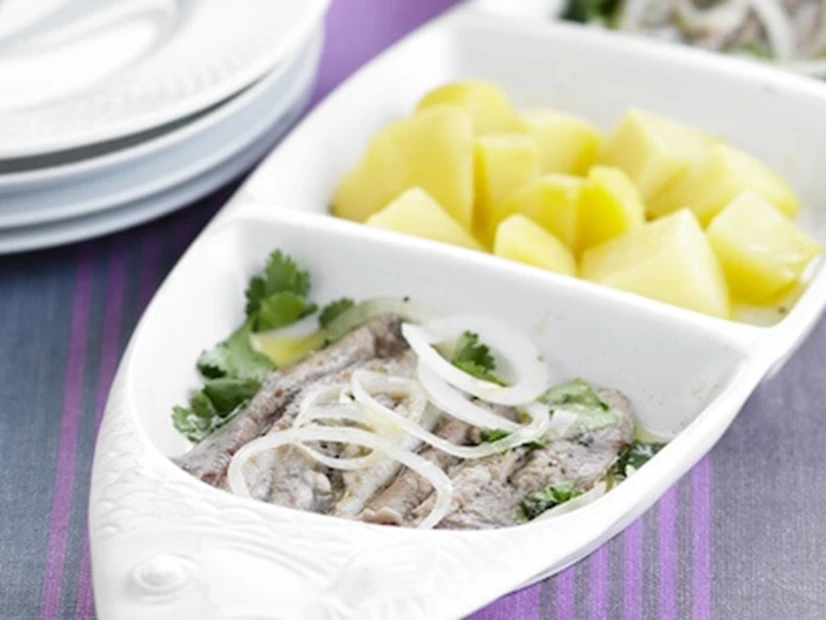Cubra com a cebola e o alho picado. Regue com o azeite, o vinagre, umas gotas de sumo de limão e polvilhe com coentros frescos. Sirva acompanhado com batatas cozidas.