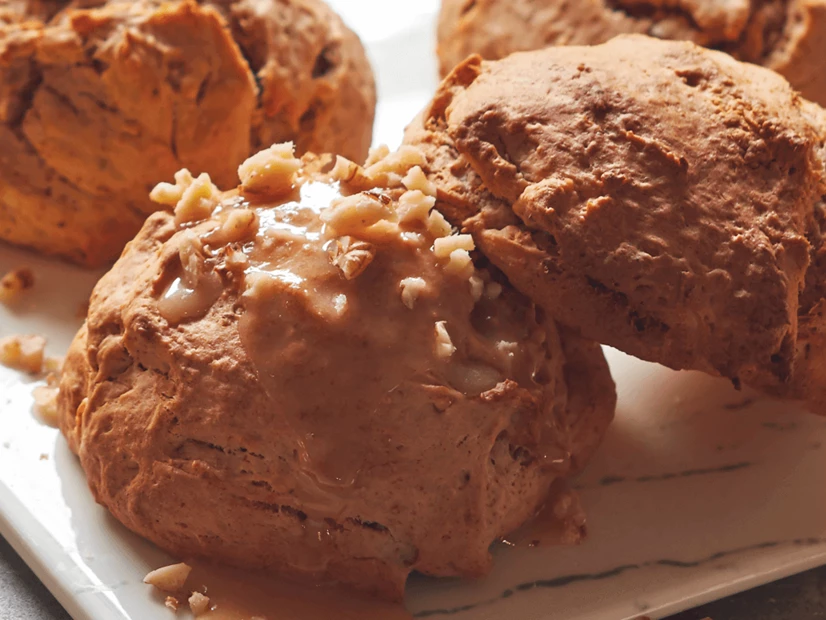 Leve ao forno pré-aquecido a 180ºC por cerca de 25 minutos ou até os scones crescerem e ficarem bem dourados. Sirva com o seu topping preferido e nozes picadas.