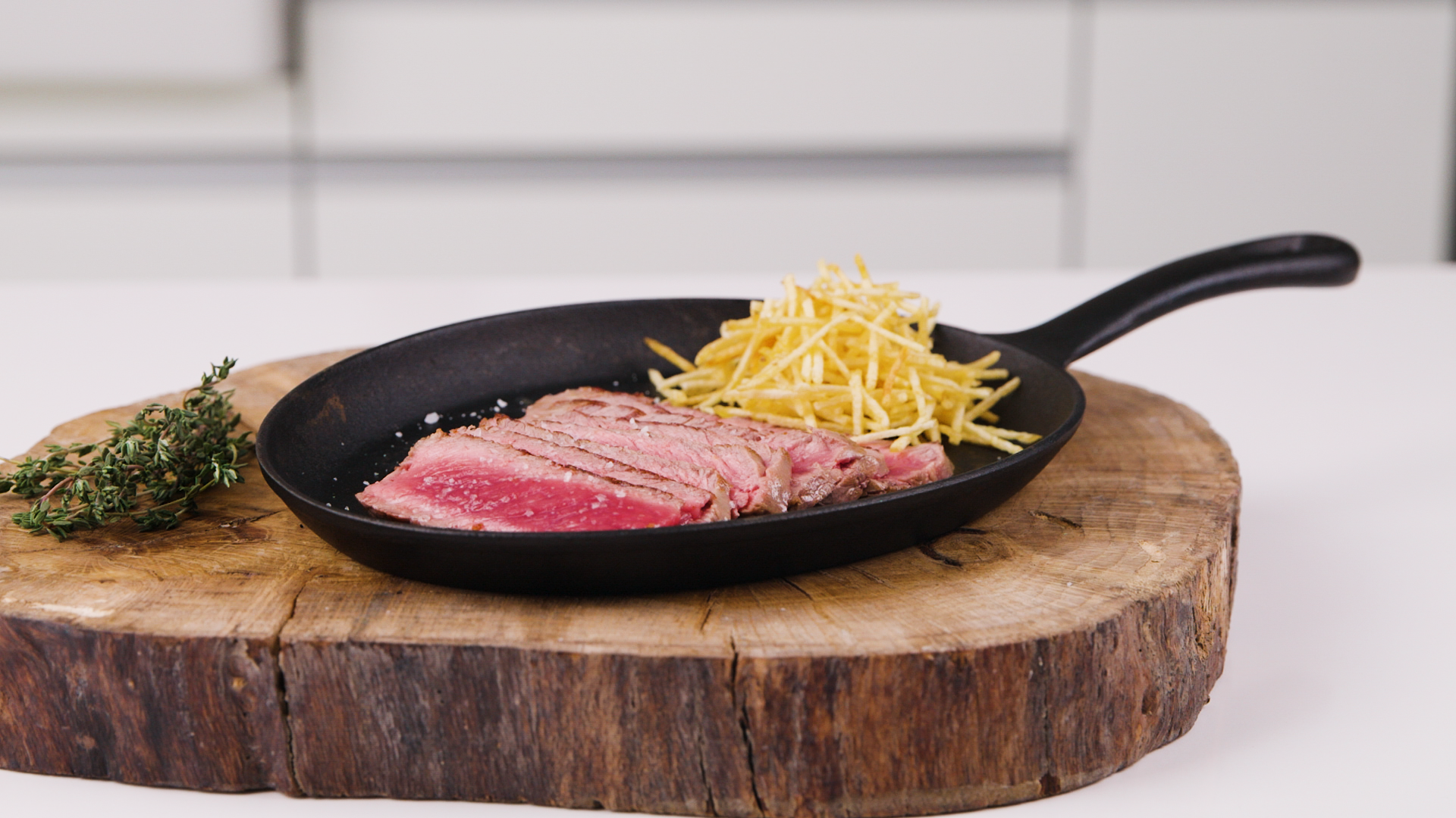 Coloque a carne temperada com sal e, assim que ficar tostada, vire.