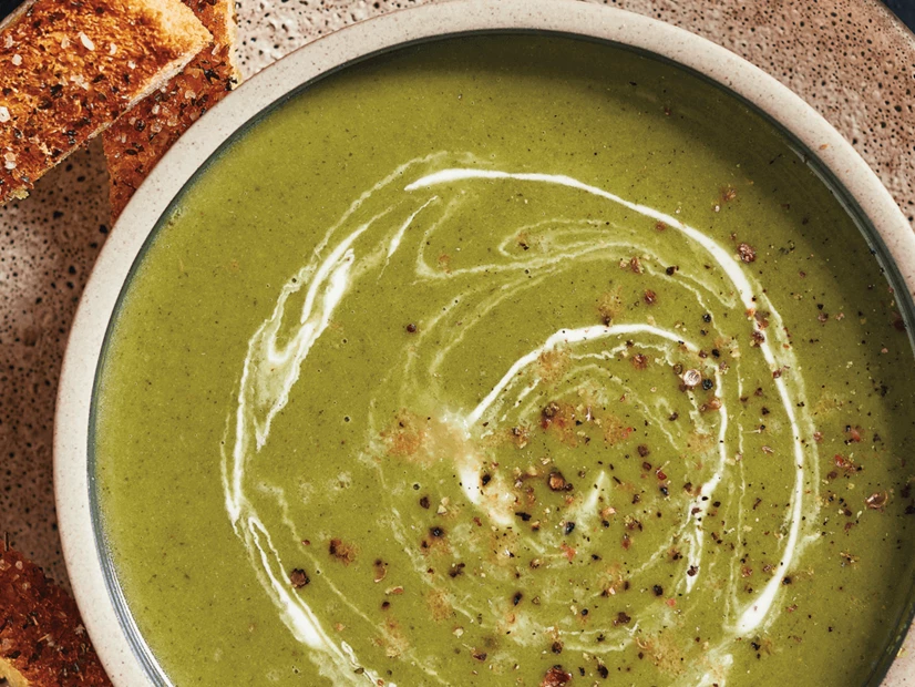 Junte os brócolos assados, o caldo de galinha, os coentros e os espinafres.