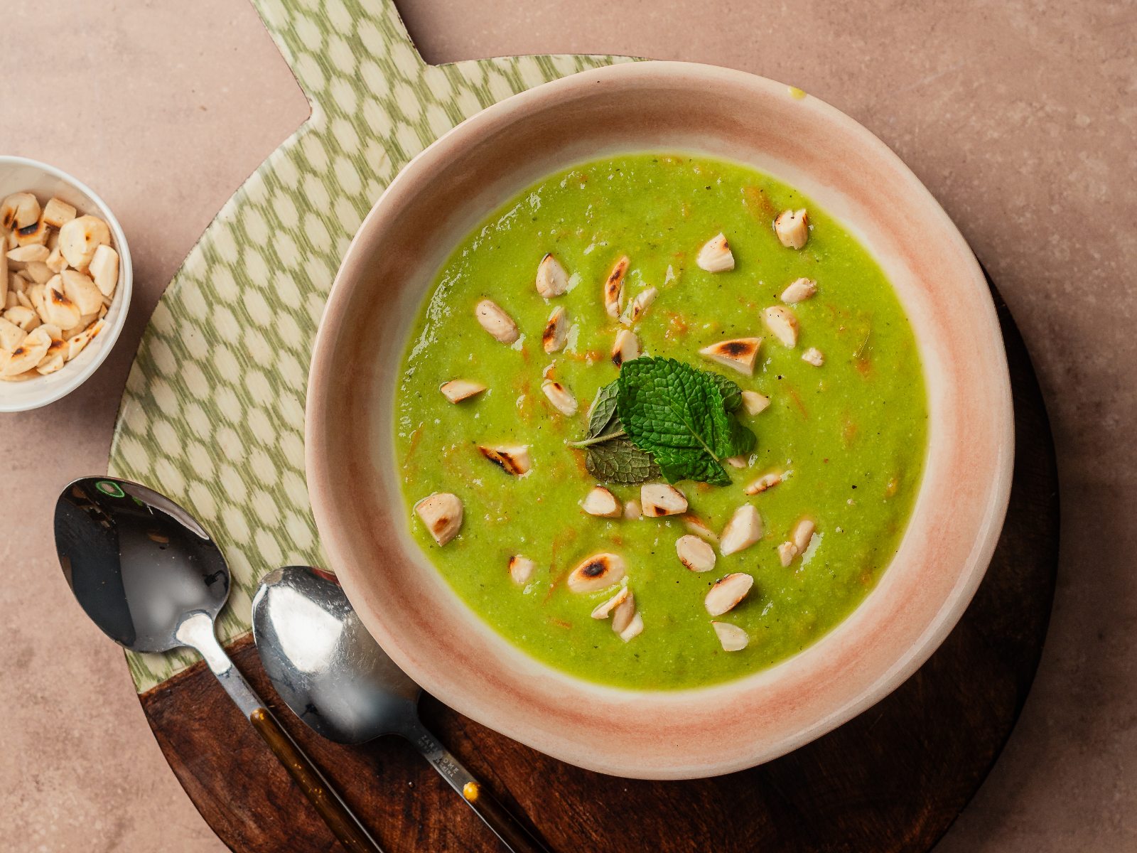 Sirva a sopa de ervilhas e polvilhe coentros picados e amêndoa tostada picada.