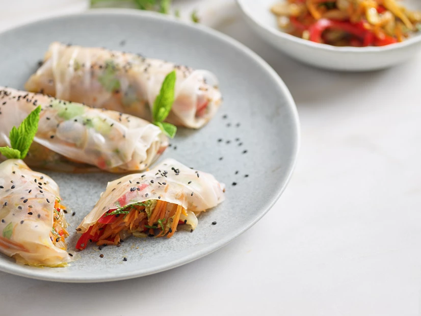 • Polvilhe os spring rolls com sementes de sésamo e sirva.