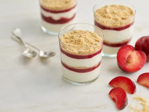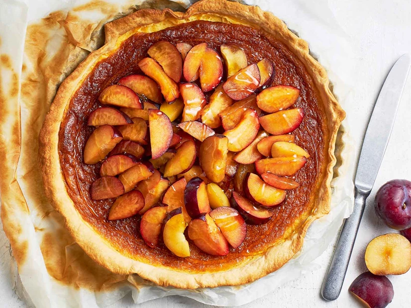 • Retire do forno e disponha as ameixas cortadas em gomos por cima da tarte.