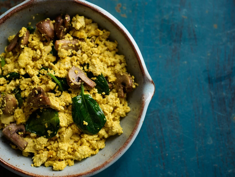 • Numa frigideira, aqueça o azeite e a curcuma e salteie o tofu até ficar seco e dourado (cerca de 3 minutos).