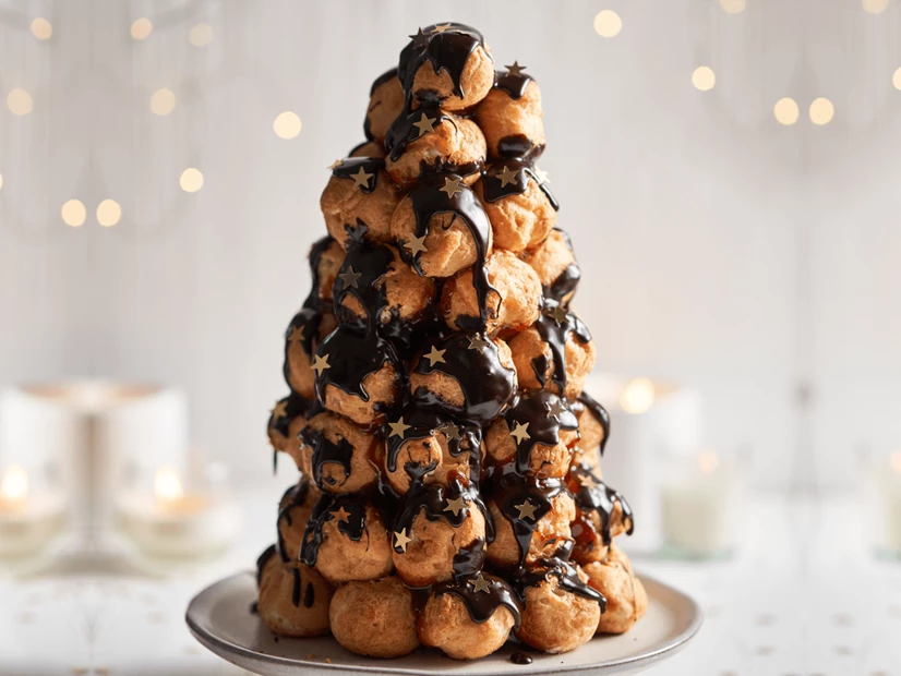 Crie uma pirâmide com os profiteroles recheados, colando-os entre si com o caramelo.