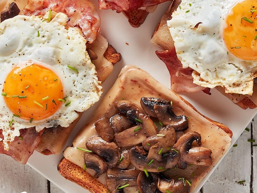 Monte as tostas acabadas de sair do forno com uma camada de cogumelos, duas fatias de bacon sobrepostas e um ovo.