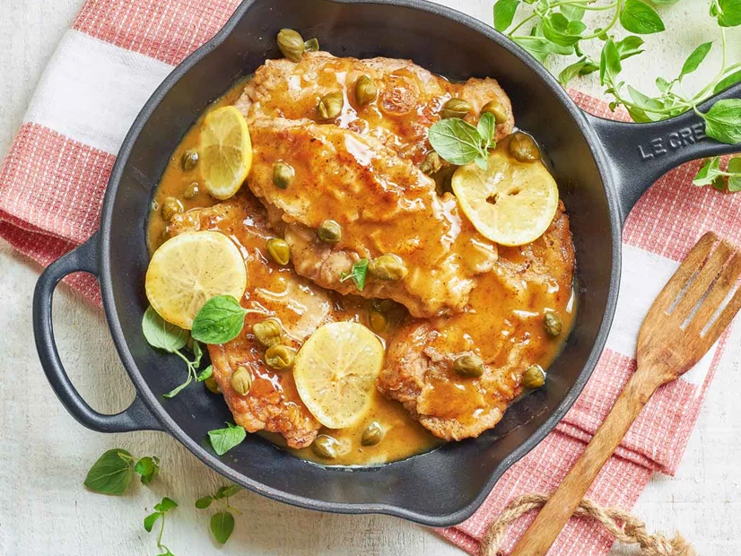 Retire-a e, sem lavar a frigideira, adicione o azeite, o vinho branco, o caldo de galinha, o limão cortado em rodelas finas, as alcaparras e salsa picada.
