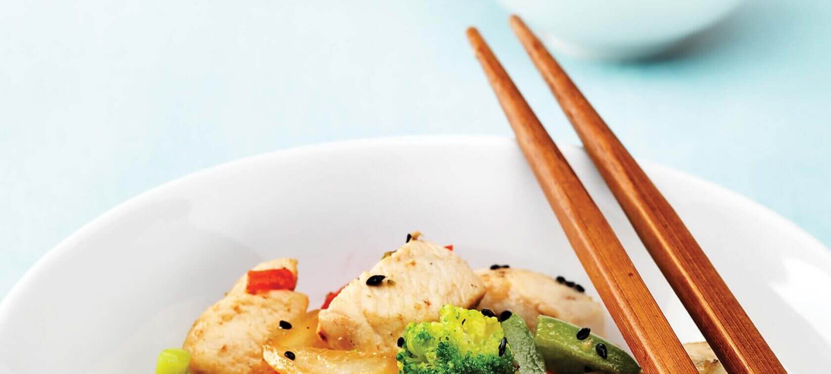 Comece a preparar os wraps: disponha um wrap num prato e recheie a gosto com folhas de rúcula, cebola roxa, tomate cereja, as tiras de frango e de ananás e decore com coentros frescos. Feche o Wrap e está pronto a servir.