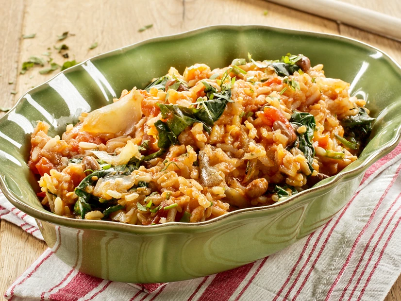 Entretanto, escorra o feijão e junte‑o aos espinafres cozidos e ao bacalhau. Quando terminar a cozedura, acrescente‑os ao arroz e envolva com a espátula.