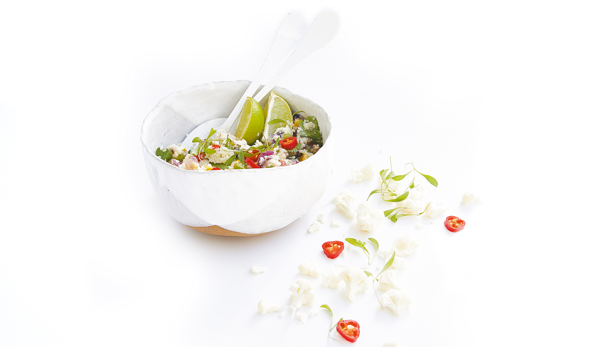 Junte o molho à couve flor e envolva bem. Sirva com raspas de lima e malagueta vermelha às rodelas.