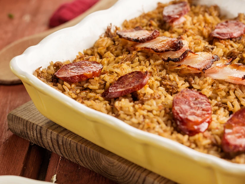 Num recipiente, misture o arroz e pato e disponha-o num pirex. Verta 230 g de caldo da cozedura sobe o arroz e enfeite com as rodelas de chouriço e com o bacon.
