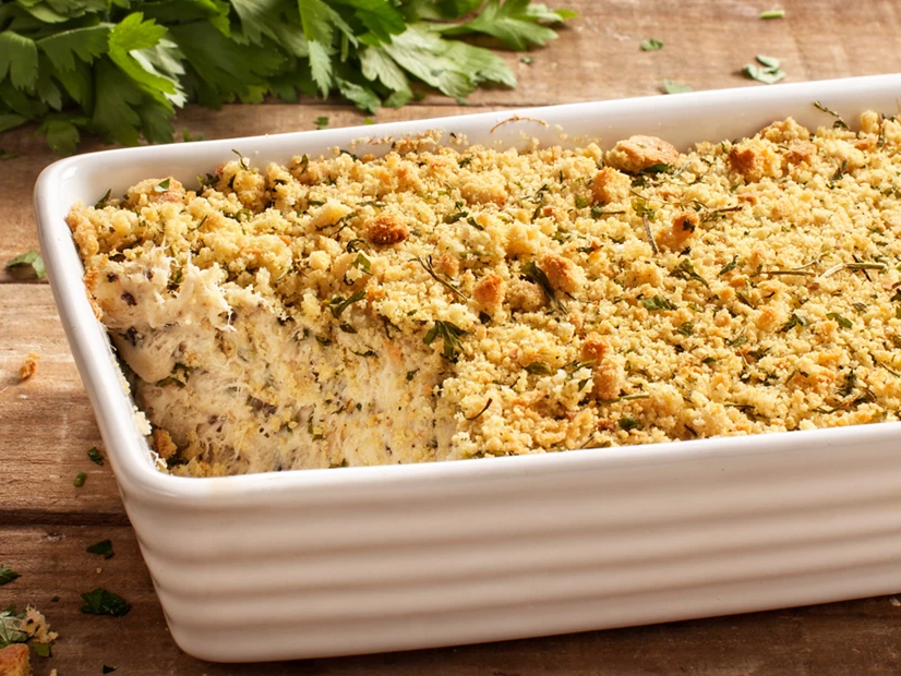 Acrescente o preparado de bacalhau e 100 gramas da mistura de broa e salsa reservadas e, com a ajuda da espátula, envolva bem. Disponha o preparado num pirex, cubra-o com a restante mistura de broa e salsa e leve ao forno, pré-aquecido a 200°C, até dourar (cerca de 20 minutos).