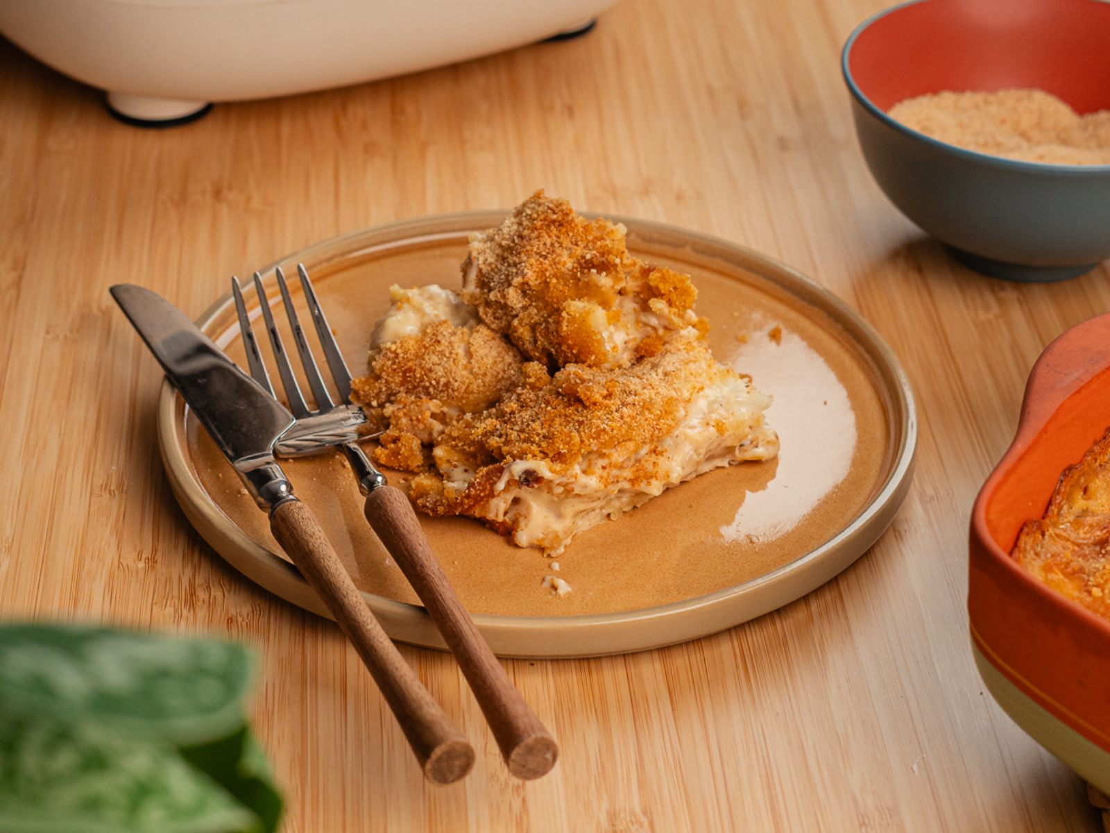 Coloque a mistura num pirex, polvilhe com o pão ralado e leve ao forno durante cerca de 20 minutos (ou até ficar dourado).