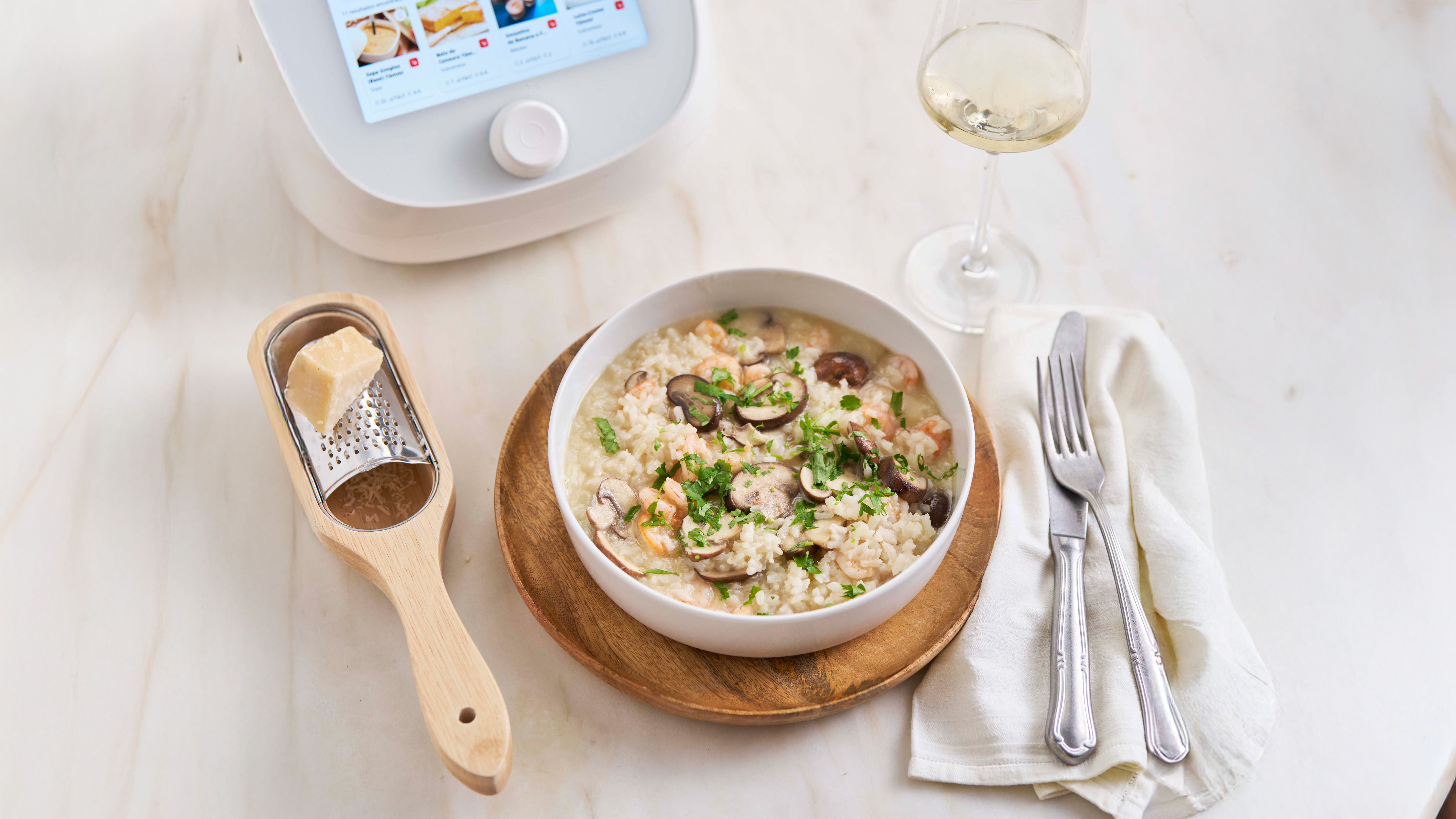 Ainda com o misturador sobre a lâmina, junte o molho bechamel reservado, as natas, sal e pimenta a gosto e programe 2 minutos, a 95°C, velocidade 2 na Rotação Inversa.